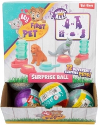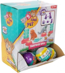 Diese niedliche Überraschungskugel MY FIRST PET erfreut jeden kleinen Tierfreund. Im Inneren befindet sich eine Figur eines Hündchens oder Kätzchens sowie drei Zubehörteile für spielerisches Pflegen eines Haustiers.