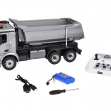 Die 2,4‑GHz‑Fernsteuerung gewährleistet sanfte Steuerung, die Kontrolle von Licht und Sound sowie das elektrische Heben/Senken der Mulde. Praktisch sind zudem das automatische Pairing und der Energiesparmodus. Große Räder mit gummierten Profilreifen halten die Spur auf unterschiedlichen Untergründen, und die Spurverstellung der Vorderachse ist ebenfalls vorhanden.