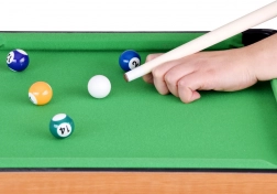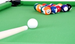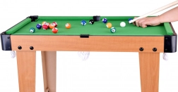 Holzbeine und grünes Tuch sorgen für Stabilität, gleichmäßiges Rollen der Kugeln und eine Optik wie am echten Tisch.