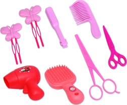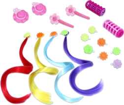 • Komplettes Zubehörset – Kamm, „Lockenstab“, Spangen und bunte Strähnen.