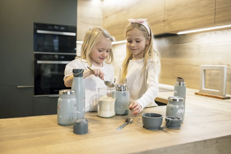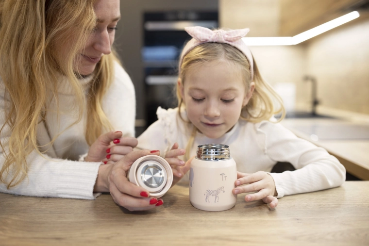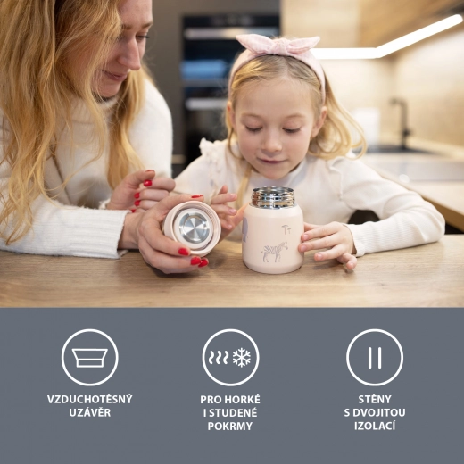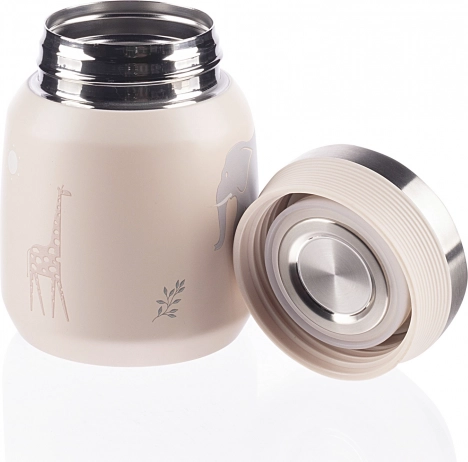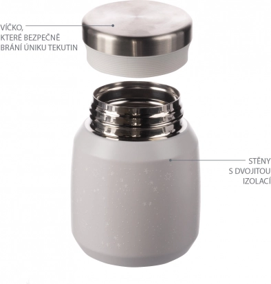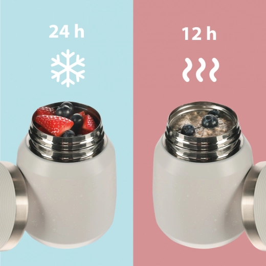 Ein hochwertiger Thermobehälter für Mahlzeiten und Brei mit einem Volumen von 300 ml hält warmes Essen bis zu 12 Stunden und kaltes bis zu 24 Stunden. Er besteht aus hochwertigem Edelstahl, der korrosionsbeständig ist. Der dichte Deckel sorgt dafür, dass der Thermobehälter nicht ausläuft. Dank der Vakuumisolierung erwärmt sich die Außenfläche bei heißem Inhalt nicht.
