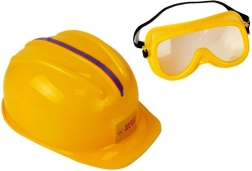 Der gelbe Helm und die transparente Brille bieten eine Schutzsimulation für sicheres und realistisches Spielen.