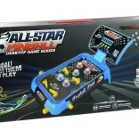 Das Spiel ist für alle Kinder ab 4 Jahren geeignet. Es wird mit 3 Stück LR14 (C) 1,5V Batterien betrieben, die nicht im Lieferumfang enthalten sind. Das Spielzeug besteht aus robustem und widerstandsfähigem Kunststoff. Die Konstruktion ist frei von scharfen Kanten und Teilen, sodass der Spielspaß angenehm und vor allem sicher ist. Das Pinball-Set entspricht der Norm EN 71 und ist in einer dunklen, mit Sportmotiven verzierten Box verpackt. Im oberen Teil der Box befindet sich ein Griff, der den Transport des Spielzeugs erleichtert. Es ist eine großartige Geschenkidee für ein Kind, das Herausforderungen liebt.