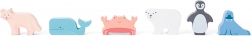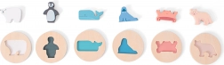 Dieses hochwertige Holzpuzzle verbindet Spiel und Lernen. Die Tiere – Seehund, Eisbär, Krabbe, Pinguin, Fuchs und Schwertwal – werden in runde Marken mit Umrissaussparung und passender Farbe eingesetzt, was die Orientierung erleichtert und die Erkennung von Farben und Formen stärkt.