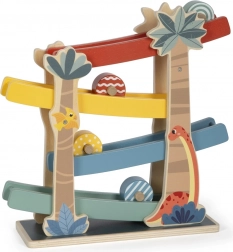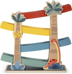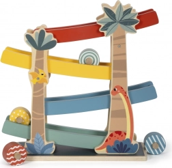 Diese Dino-Holzbahn mit Dinosauriermotiven ist ein ideales interaktives Spielzeug für Kinder. Gemeinsam mit bunten, gemusterten Scheiben, die die Rampen hinunterrollen, bietet sie eine unterhaltsame Lernerfahrung über Bewegung und Schwerkraft. Produktmerkmale: