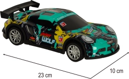 Sportliche Karosserie, auffällige Grafik und die Maße 23 × 10 × 6,5 cm machen den Wagen zum idealen Begleiter für Fahrten drinnen und draußen. Ein stabiles Fahrwerk und ein Spoiler unterstützen eine flotte und gleichmäßige Fahrt.