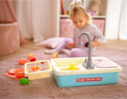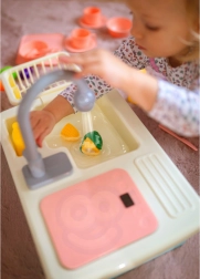 Schenken Sie Kindern ihre eigene Küchenecke. Die realistische Spüle mit funktionierender Wasserpumpe (Betrieb mit 2× AA, nicht enthalten) ermöglicht Abspülen wie in einer echten Küche. Das umfangreiche Zubehör regt die Fantasie an, vermittelt gute Gewohnheiten und fördert die Entwicklung der Koordinationsfähigkeiten.