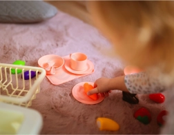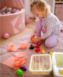 Das Set enthält Teller, Schüsseln, Becher, Besteck, ein Kännchen, ein Schneidebrett und Lebensmittel aus Kunststoff mit Klettverschluss (Obst und Gemüse) für sicheres „Schneiden“. So können Kinder ein Menü zubereiten, servieren und anschließend das Geschirr spülen – vom Spiel zur Verantwortung ist es nur ein kleiner Schritt.