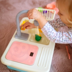 Die eingebaute Pumpe bringt nach dem Einlegen von 2× AA Batterien das Wasser in der Spüle in Umlauf. Kinder genießen realitätsnahes Abspülen und sicheres Spielen ohne große Unordnung.