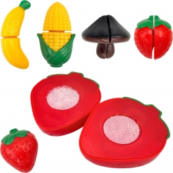 Banane, Mais, Pilz, Erdbeeren und weitere Stücke lassen sich „schneiden“ und wieder zusammensetzen – ideal zum Trainieren der Feinmotorik und für spielerisches Lernen.