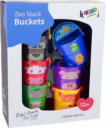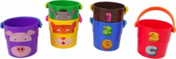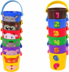 Diese verschiedenfarbigen Eimer stellen Tierfiguren dar, wie zum Beispiel einen Bären, Tiger oder eine Kuh, was Ihrem Kind ermöglicht, verschiedene Tierarten kennenzulernen. Dank der unterschiedlichen Formen von Löchern am Boden der Eimer können Kinder verschiedene Wasserströme beobachten, was ein unglaubliches Erlebnis für kleine Beobachter ist. Eine weitere Möglichkeit ist das Stapeln von Eimern zu einer Pyramide, was die Geschicklichkeit und räumliche Vorstellungskraft der Kinder fördert.