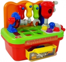 Kleine Werkzeuge wie Säge oder Bohrmaschine geben Geräusche von sich und leuchten mit einer roten LED. Unsere kleine Werkbank verfügt außerdem über eine Schublade, in der man Schätze und Werkzeuge aufbewahren kann. Schrauben in Knopfform fördern die Genauigkeit Ihres Kindes. Der Schraubstock lässt sich rundherum drehen. Mit diesem Set lernt Ihr Kind nicht nur Formen und Strukturen, sondern auch Farben. Es kann die Namen der Werkzeuge, ihre Funktionen kennenlernen und zusätzliche Licht- und Soundeffekte bereichern das Spiel und beschäftigen es stundenlang. Es wird zum kleinen Heimwerker.