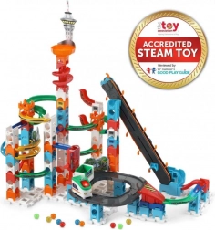 Lange Abfahrten, Spiralen und Schleifen sorgen für Spannung und Wettkampfatmosphäre. Verfolgen Sie die rasenden Murmeln und veranstalten Sie ein Familienturnier.