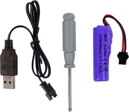 Im Lieferumfang: wiederaufladbarer 3,7‑V‑500‑mAh‑Akku, USB‑Ladegerät und Wartungswerkzeug. Nur noch AA‑Batterien in die Fernsteuerung einsetzen und losfahren.