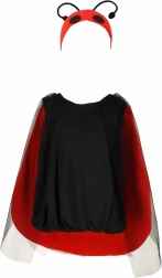 Perfektes zweiteiliges Marienkäferkostüm für Kinder, bestehend aus einem roten Umhang mit schwarzen Punkten und einer Mütze mit Fühlern. Es ist die perfekte Wahl für verschiedene Feiern und Themenpartys.