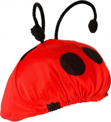 Roter Umhang mit schwarzen Punkten und eine Mütze mit Fühlern für ein spielerisches Aussehen.
