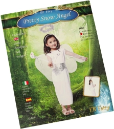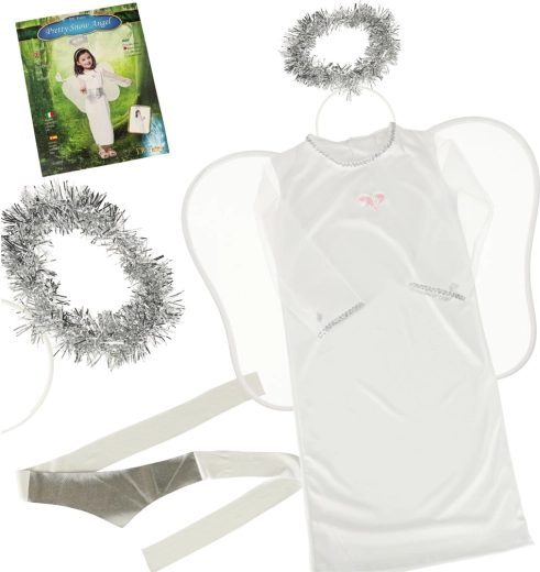 Das Kostüm enthält einen weißen Rock, einen Gürtel, einen Haarreif mit Heiligenschein und Engelsflügel, die das Erscheinungsbild eines Engels vervollständigen.