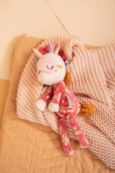 Die Schlafmaske und die pastellfarbene Mähne unterstützen Abendrituale und machen Lena zur geliebten Gutenacht-Begleiterin.