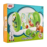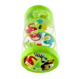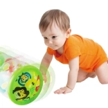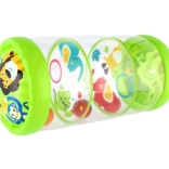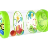 Die Walze ist mit bunten Tierillustrationen verziert und enthält drei Bälle, die beim Bewegen sanft rasseln, was Kinder erfreut und stimuliert.