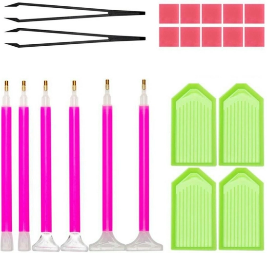Set mit 22 Zubehörteilen für Diamantsticken/Malen (Diamond Painting). Komplettset für den Start Ihres Abenteuers mit Diamantmosaik. Das Set enthält 6 Stifte mit manuellen Aufsätzen, 2 Pinzetten, 4 Diamant-Schalen und 10 Klebequadrate.