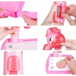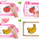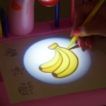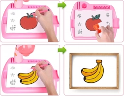 Austauschbare Dias bieten abwechslungsreiche Motive von Tieren, Fahrzeugen, Obst und Gemüse, sodass Kinder nicht nur ihre Feinmotorik trainieren, sondern auch Formen- und Farberkennung. Ein Set mit 12 farbigen Filzstiften, ein Zeichenblock und Halterungen für Schreibutensilien sorgen für Ordnung und schnellen Zugriff.