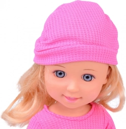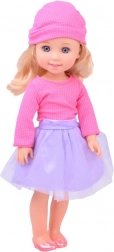 Rosa Bluse, violetter Rock und rosa Mütze verleihen der Puppe einen eleganten Look, ideal für modisches Spiel.