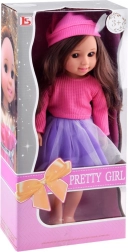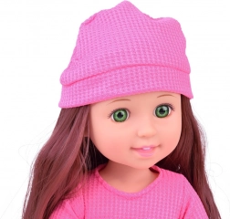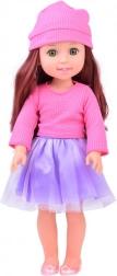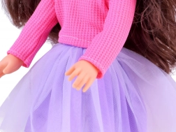 Elegante Puppe, 36 cm groß, ist ein idealer Begleiter für kleine Mädchen. Dank der langen braunen welligen Haare, die gekämmt und gestylt werden können, stärkt sie das Modebewusstsein der Kinder und entwickelt Fähigkeiten in der Haarpflege. Sie trägt eine stilvolle rosa Bluse und einen violetten Rock, und zusammen mit rosa Schuhen und Mütze bietet sie einen eleganten Look. Bewegliche Arme und Beine erleichtern die Positionierung der Puppe in verschiedenen Posen, was kreatives und fantasievolles Spiel fördert.
