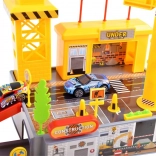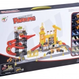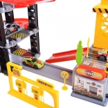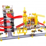 Baut eure eigene Stadt! Das vierstöckige Parkhaus mit Abfahrten, Parkplätzen, Tankstelle und Verkehrszeichen ist über eine breite Straße mit der Baustellenzone verbunden. Kinder können die Pkw abstellen und mit der Baustellencrew loslegen, wo Kran, Bagger, Bulldozer und Presslufthammer warten.