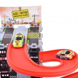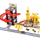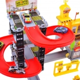 Die mehrstöckige Garage mit roten Rutschenrampen ermöglicht ein flüssiges Herunterfahren der Autos und dynamisches Spiel. Parkplätze und Einfahrten unterstützen einen realistischen Ablauf.