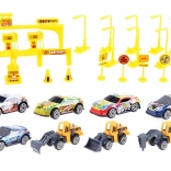 Enthalten sind 5 Pkw, 3 Baufahrzeuge und Verkehrszeichen. Kinder bauen sich eine komplette Welt mit Parkhaus, Tankstelle und Straßenelementen.