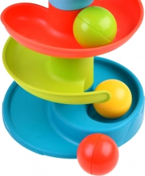 Das Set enthält sechs leuchtend bunte Kugeln und sechs spiralförmige Plattformen, die eine attraktive, fließende Bahn voller Bewegung und Klang bilden.