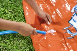 Schnelles und einfaches Setup. Rollen Sie die Rutsche einfach auf dem Rasen aus und schließen Sie den Schlauch an. Spezielle Befestigungen sorgen dafür, dass die Rutsche fest an ihrem Platz bleibt.