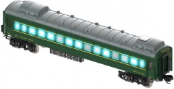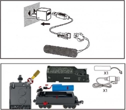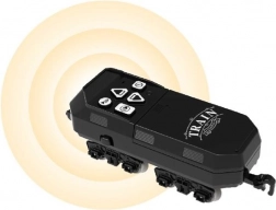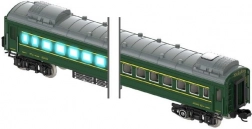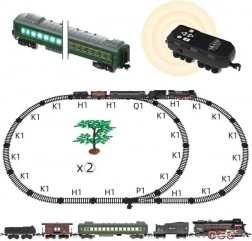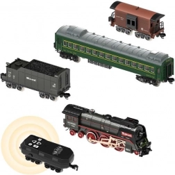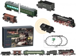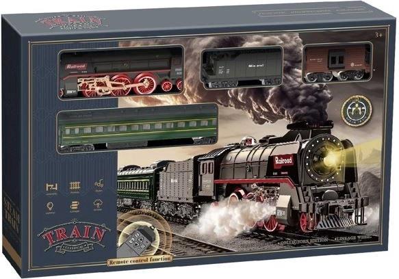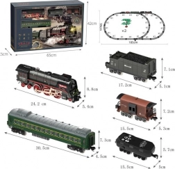 Lokomotive + 4 Waggons, Licht, Sound. Abmessungen der Fensterbox: 65 × 7,5 × 42 cm. Aufladen über USB. Beleuchteter Waggon für Passagiere. Rauchfunktion in der Lokomotive.