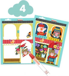Inhalt des Sets: Collage mit illustrierter Karte, vorgestanzter dicker Pappe und einer Tube Kleber; Filzcollage mit 12 Karten und 4 Bögen selbstklebender Filzteile; Color Stop mit 4 Bögen, Schablone und 4 Farbstiften; Wasserfarben mit Karte und magischem Stift; Farboffenbarung mit 3 Karten mit magischer Beschichtung; Kratzbilder mit 3 Karten und Holzwerkzeug; sowie eine übersichtliche Bildanleitung.