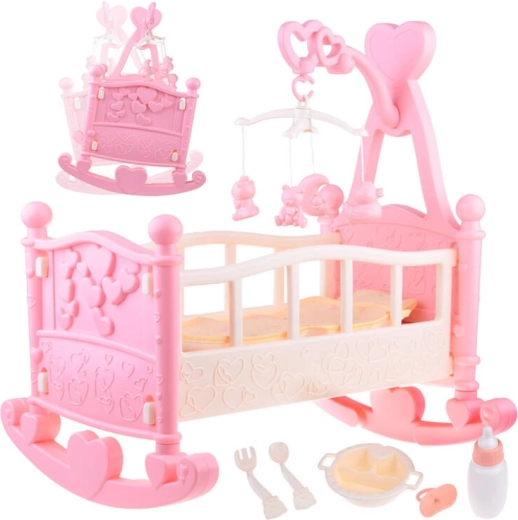 Diese Plastikwiege ist ideal für Puppen oder Kuscheltiere bis 42 cm. Geschmückt mit Herzen und einem kleinen Karussell, bietet sie Kindern Freude an der Pflege ihrer Spielzeuge und fördert gleichzeitig ihre Kreativität und Vorstellungskraft.