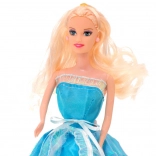 • Puppe ist in einem wunderschönen blauen Ballkleid gekleidet und hat lange blonde Haare.