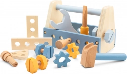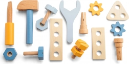 Enthalten sind 16 funktionale Teile: Hammer, Schraubendreher, Schlüssel, Nägel, Schrauben und Zahnräder für endlose Spielmöglichkeiten. Das Produkt besteht aus FSC-zertifiziertem Holz und ist damit eine nachhaltige Wahl für Eltern und Planet.