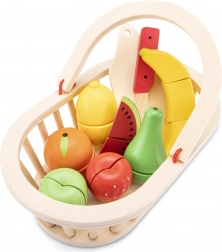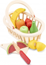 Zum Set gehören ein Schneidebrett, ein sicherer Holzmesser und eine bunte Auswahl an Obst: Wassermelone, Erdbeere, Birne, Apfel, Zitrone, Banane und Orange. Alles wird in einem robusten Holzkorb aufbewahrt, der einfaches Verstauen ermöglicht und sich fürs Einkaufen-Spielen eignet.