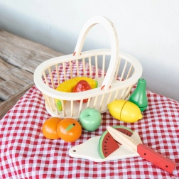 Der Korb hält alle Teile zusammen und erleichtert sowohl den Transport als auch das Aufräumen. Kinder können damit Einkaufen oder Picknick nachspielen.