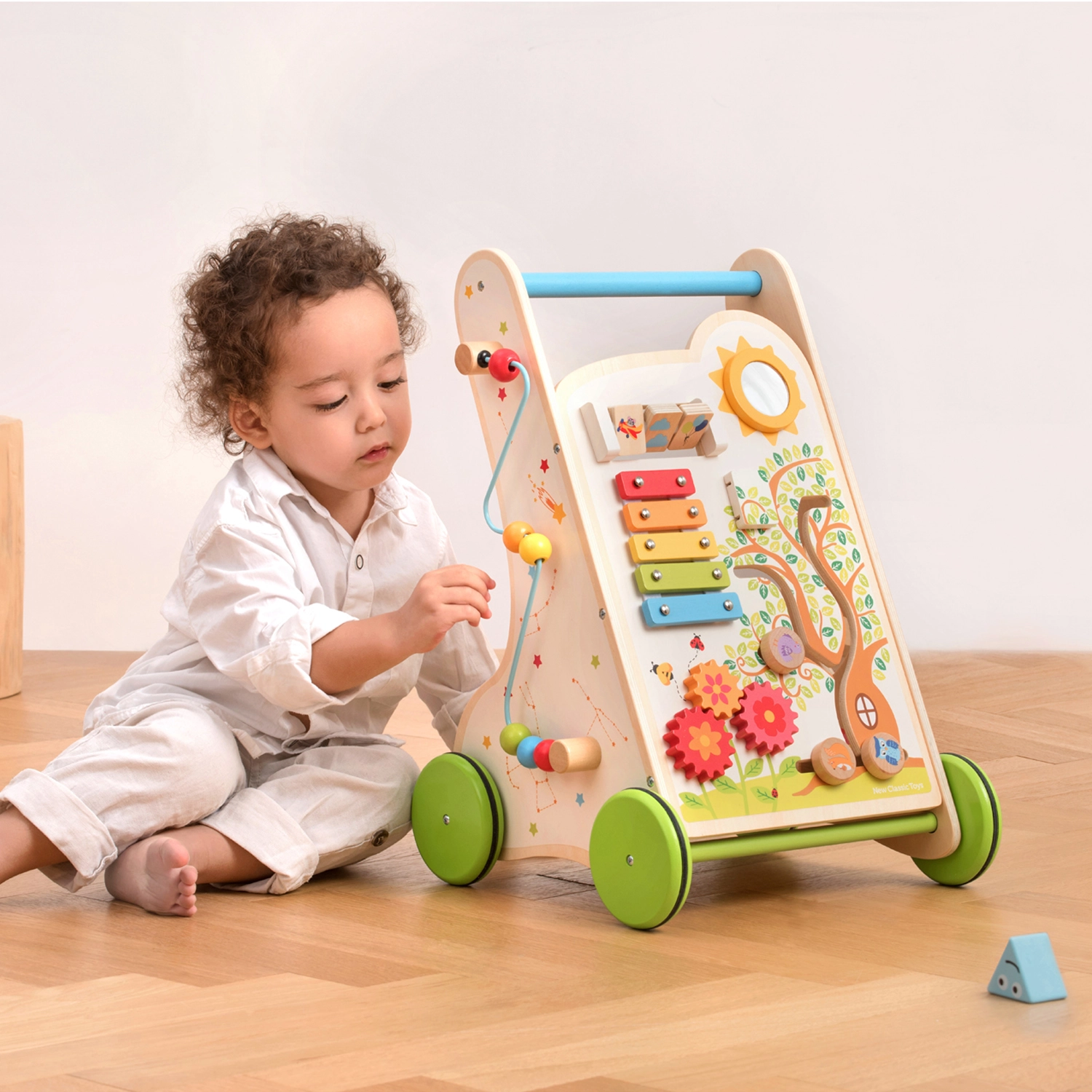 Holzlauflernwagen ist so konzipiert, dass er Kindern bei ihren ersten Schritten sicher begleitet. Dank der Gummiräder ist er leise und schonend für den Boden. Die lustigen und interaktiven Elemente wie Zahnräder, Spiegel und Xylophon regen zum Entdecken und Lernen an. Maße des Lauflernwagens: 32 x 32 x 49 cm.
