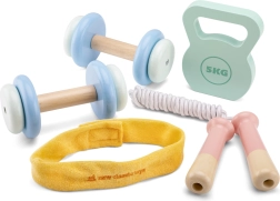 Das hölzerne Kinder-Fitness-Set ist die perfekte Möglichkeit, kleine Sportler zur Bewegung zu motivieren und das Training ihrer Eltern nachzuahmen. Enthält:
