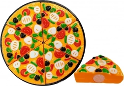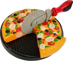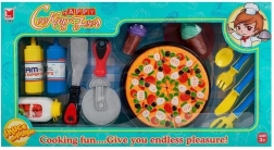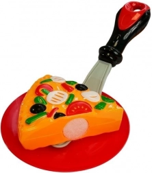 Mit diesem umfangreichen Set probieren Kinder die Zubereitung und das Servieren ihres Lieblings‑Fastfoods aus. Die Pizza besteht aus abnehmbaren Stücken, die mit Klettverschluss verbunden sind – so halten sie zusammen und lassen sich zugleich mit dem beiliegenden Schneider leicht „zerscheiden“. Ein Servierheber, Besteck, Teller sowie zwei Kunststoff-Eise für das Dessert fehlen nicht. Das Spiel unterstützt die Feinmotorik, trainiert die Koordination und entwickelt soziale Fähigkeiten beim gemeinsamen Essen.