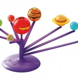 Baue aus den Stäben einen Ständer für die Planeten, setze die Planeten auf die Arme und bemale sie. Schalte abends den Projektor ein und genieße den Anblick der rotierenden Planeten.