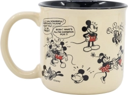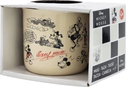 Die Tasse ist mit Illustrationen des klassischen Mickey Mouse im Comicstil verziert, die Nostalgie und den Zauber der Disney-Figuren vermitteln.