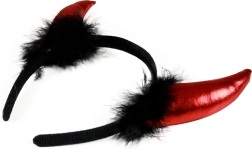 Teufelshörner auf einem Haarreif, verziert mit zarten Federn, vervollständigen dein höllisches Kostüm! Diese fantastischen Hörnchen verwandeln dich in eine charmante Teufelin oder einen Teufel!