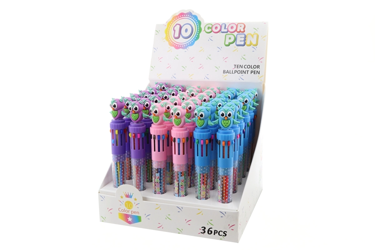 10-farbiger Kugelschreiber mit Eulenmotiv. Länge des Kugelschreibers ca. 12,5 cm (mit Eule ca. 15 cm). Das Produkt ist kein Spielzeug.