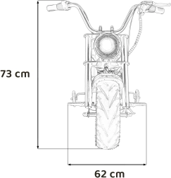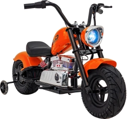 Der elektrische Chopper Warrior in Orange bietet Kindern ein authentisches Fahrerlebnis. Der leistungsstarke bürstenlose 350-W-Motor in Kombination mit dem 36-V-Akkusystem sorgt für sanfte Beschleunigung, die über den Drehgriff (Gasgriff) gesteuert wird. Breite, aufblasbare Reifen 32 × 10 cm gewährleisten guten Grip und Komfort, während Stützräder Anfängern helfen, stabil zu bleiben.