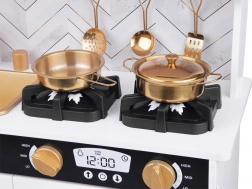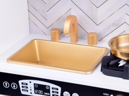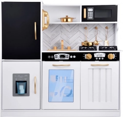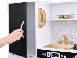 Wecken Sie das Interesse der Kinder am Kochen mit dieser Holz-Küche, die mit Liebe zum Detail gestaltet ist. Die Küche hat ein hauptsächlich weißes Design mit schwarzen und goldenen Details, die für Eleganz sorgen. Kinder können mit Kreide auf die Tafel am Kühlschrank schreiben, das Kochen im Ofen nachahmen und mit realistischen Geräusch- und Lichteffekten Mahlzeiten zubereiten.