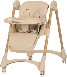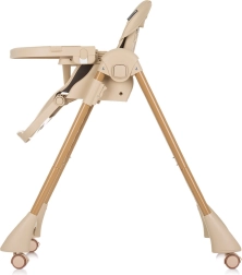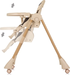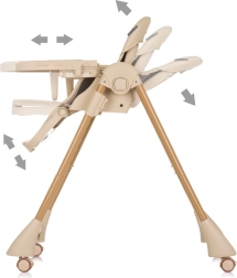 Für sauberes und bequemes Essen steht ein doppeltes Tablett zur Verfügung – den oberen Teil können Sie jederzeit abnehmen und reinigen, während das untere Tablett mit schützendem T-Bügel das Kind sicher an Ort und Stelle hält. Das Tablett lässt sich in 3 Positionen vor- und zurückschieben. Vier Räder ermöglichen ein leichtes Bewegen in der Wohnung, und nach dem Essen lässt sich der Hochstuhl zu einem kompakten Format zusammenklappen, um Platz zu sparen.