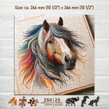 Das fertige Puzzle misst etwa 26,6 × 26,6 cm und wird sowohl zu einer schönen Dekoration als auch zu einer angenehmen Herausforderung für alle, die ein hochwertiges Holzpuzzle mit Pferdemotiv suchen.